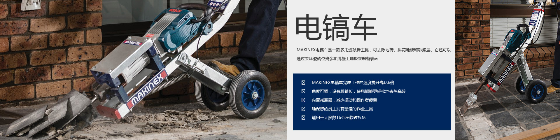 MAKINEX電鎬車是一款多用途破拆工具,可去除地磚、拼花地板和砂漿層。它還可以通過(guò)去除瓷磚位殘余和混凝土地板來(lái)制…